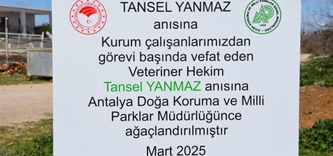 Antalya Doğa Koruma ve Milli Parklar Müdürlüğümüz olarak, geçtiğimiz ay görevi başında hayatını kaybeden mesai arkadaşımız Veteriner Hekim Tansel Yanmaz'ı anmak ve hatırasını yaşatmak amacıyla anlamlı bir ağaçlandırma etkinliği düzenledi. Mesai arkadaşları, ailesi, eşi ve küçük oğlu Alp'in katılımıyla gerçekleştirilen etkinlikte Kurşunlu Şelalesi Tabiat Parkı içerisinde 100 defne fidanı toprakla buluşturuldu.