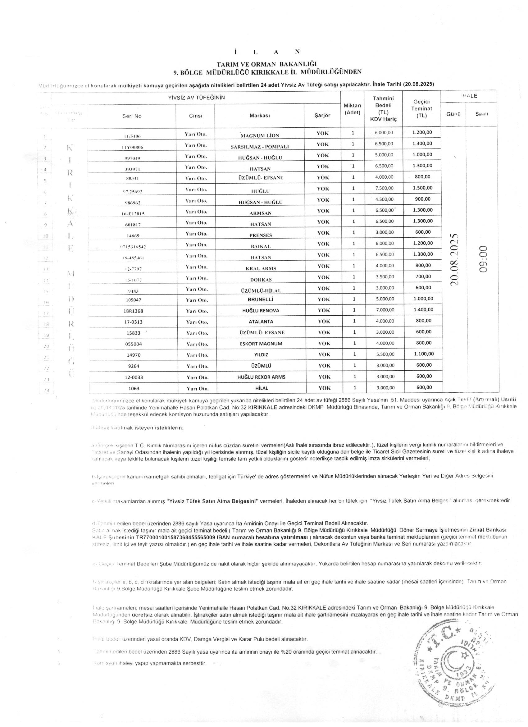 2886 sayılı Yasanın 51. maddesi gereği pazarlık usülü ile 20.08.2025 tarihinde Saat 09:00 da satışa